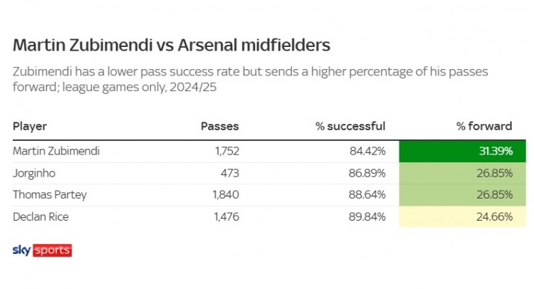 24/25赛季,祖比门迪与阿森纳其他中场的传球数据对比